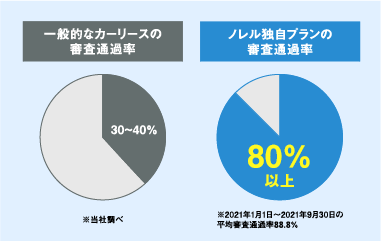カーリースは申し込み時に信販会社による与信審査が発生します。現在の与信審査の仕組みでは、支払い能力がありながらも審査に通ることができず、諦めてしまう方々が多くいらっしゃるのが現状です。ノレルは独自の審査基準により審査通過率80%以上の実績があるため、審査に落ちてしまった場合でも別プランをご提案することが可能です。